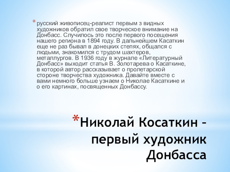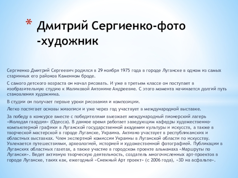 С самого детского возраста он начал рисовать. И уже в третьем классе он поступает в изобразительную студию к Маликовой Антонине Андреевне. С этого момента начинается долгий путь становления художника.