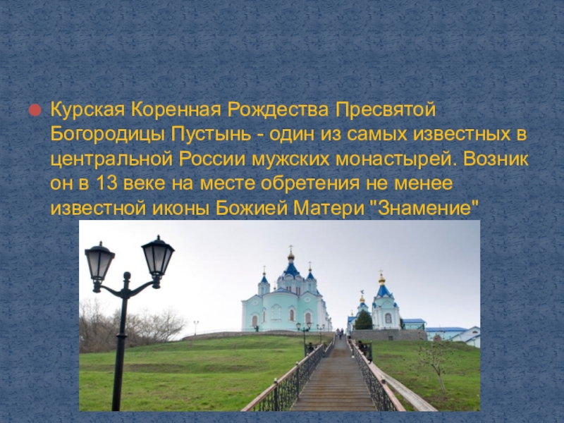 Слайд 7Курская Коренная Рождества Пресвятой Богородицы Пустынь - один из самых известных