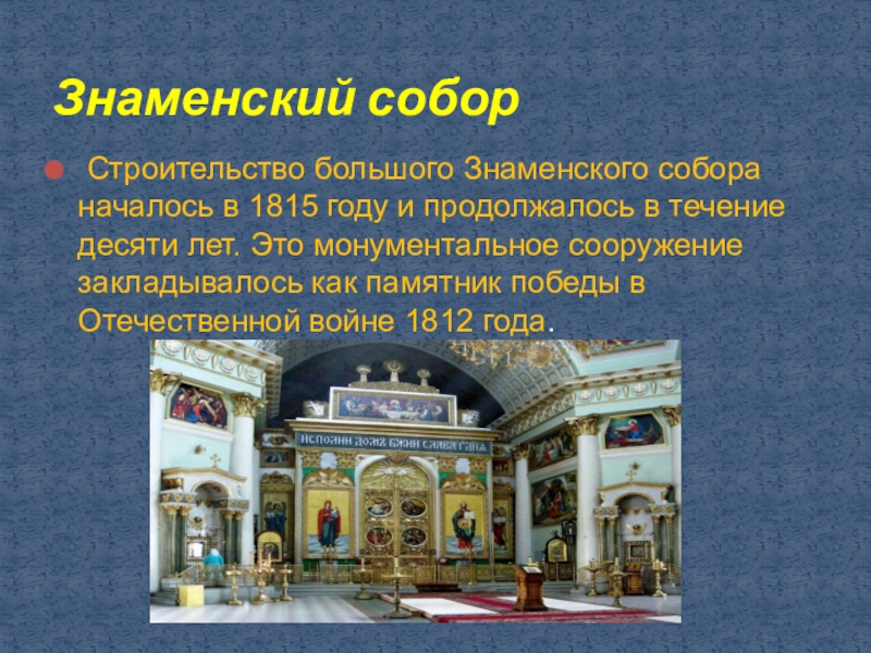 Знаменский собор  Строительство большого Знаменского собора началось в 1815 году и продолжалось в течение десяти лет. Это