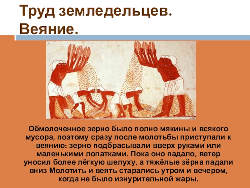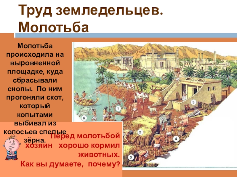 Молотьба происходила на выровненной площадке, куда сбрасывали снопы. По ним прогоняли скот, который копытами выбивал из колосьев спелые зёрна.