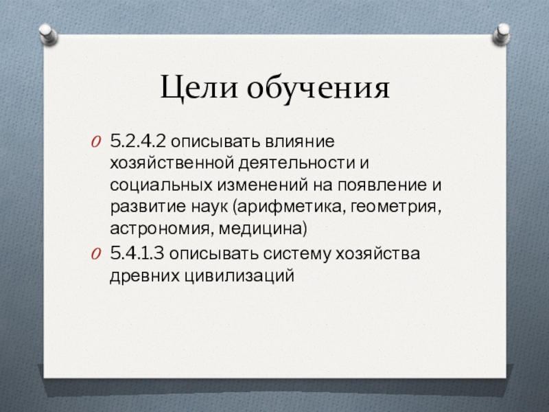 Цели обучения 5.2.4.2 описывать влияние хозяйственной деятельности и социальных изменений на появление и развитие наук (арифметика, геометрия, астрономия, медицина)5.4.1.3 описывать систему хозяйства древних цивилизаций