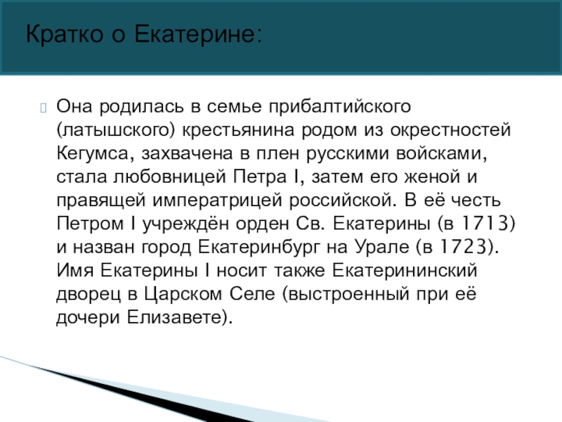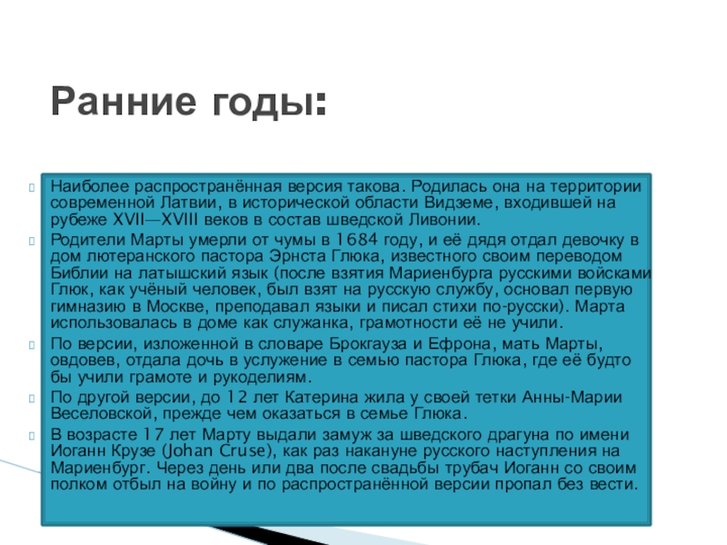 По наиболее распространённой версии настоящее имя Екатерины — Марта Самуиловна Скавронская, позднее крещена Петром I под новым именем Екатерина Алексеевна Михайлова.
