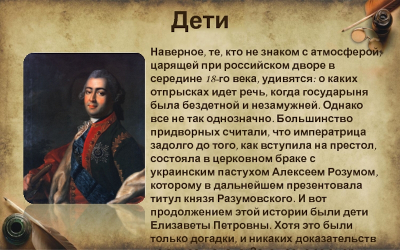в середине 18-го века, удивятся: о каких отпрысках идет речь, когда государыня была бездетной и незамужней. Однако все не так однозначно. Большинство придворных считали, что императрица задолго до того, как вступила на престол, состояла в церковном браке с украинским пастухом Алексеем Розумом, которому в дальнейшем презентовала титул князя Разумовского. И вот продолжением этой истории были дети Елизаветы Петровны. Хотя это были только догадки, и никаких доказательств не существовало. Зато после ее смерти в обществе то и дело появлялись самозванцы, которые объявляли себя ее наследниками.
