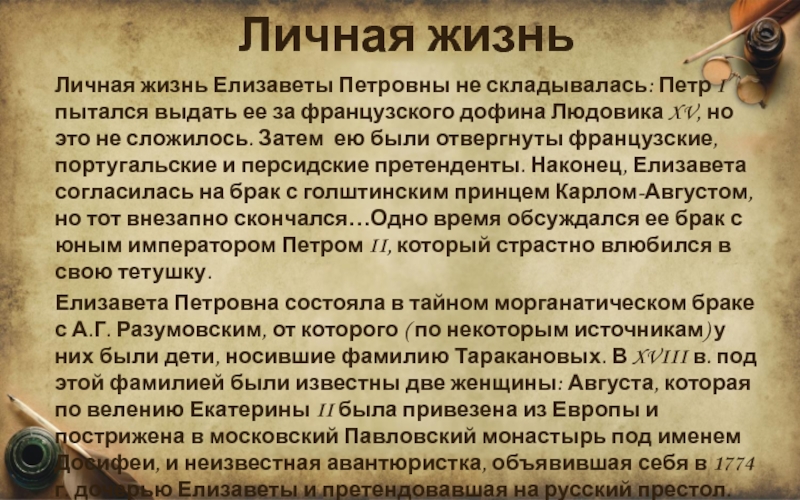 Елизавета Петровна состояла в тайном морганатическом браке с А.Г. Разумовским, от которого ( по некоторым источникам) у них были дети, носившие фамилию Таракановых. В XVIII в. под этой фамилией были известны две женщины: Августа, которая по велению Екатерины II была привезена из Европы и пострижена в московский Павловский монастырь под именем Досифеи, и неизвестная авантюристка, объявившая себя в 1774 г. дочерью Елизаветы и претендовавшая на русский престол. Была арестована и заключена в Петропавловскую крепость, где скончалась в 1775 г., скрыв тайну своего происхождения даже от священника.