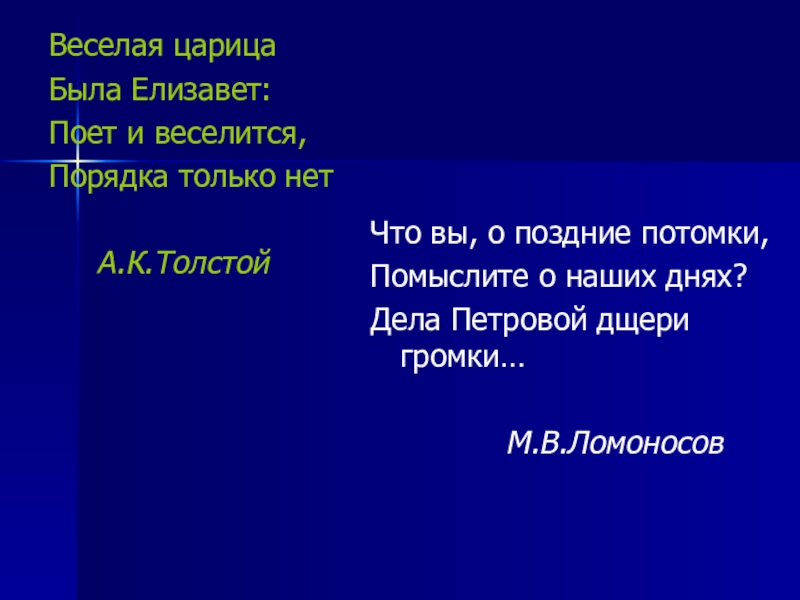 Веселая царицаБыла Елизавет:Поет и веселится,Порядка только нет   А.К.ТолстойЧто вы, о поздние потомки,Помыслите о наших днях?Дела