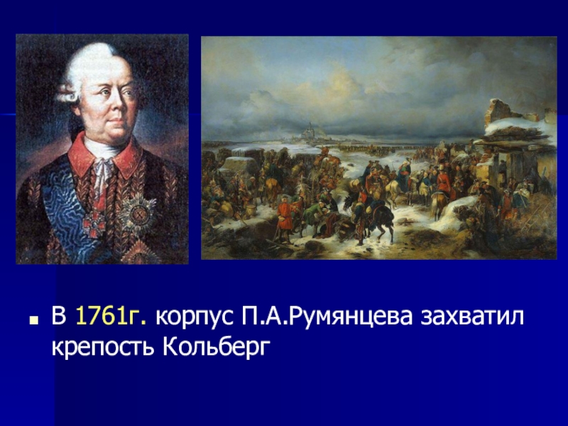 Слайд 16В 1761г. корпус П.А.Румянцева захватил крепость Кольберг