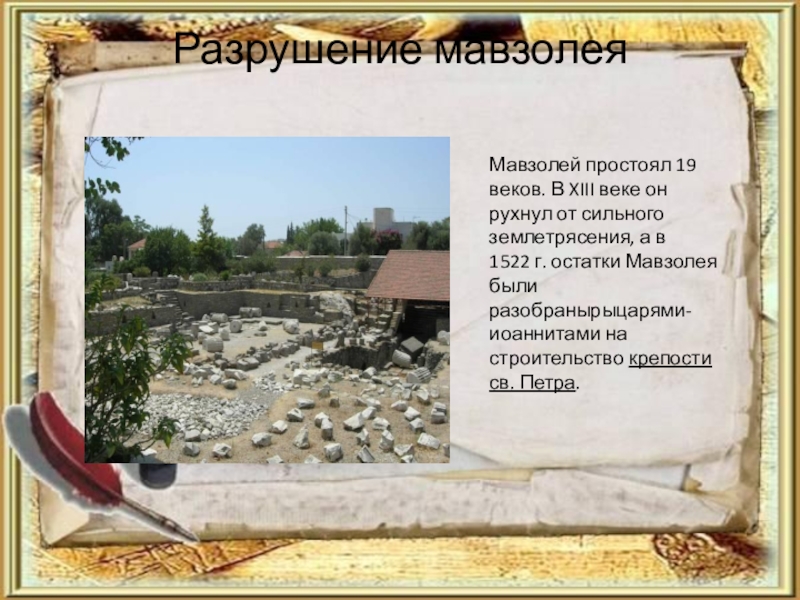 сильного землетрясения, а в 1522 г. остатки Мавзолея были разобранырыцарями-иоаннитами на строительство крепости св. Петра.