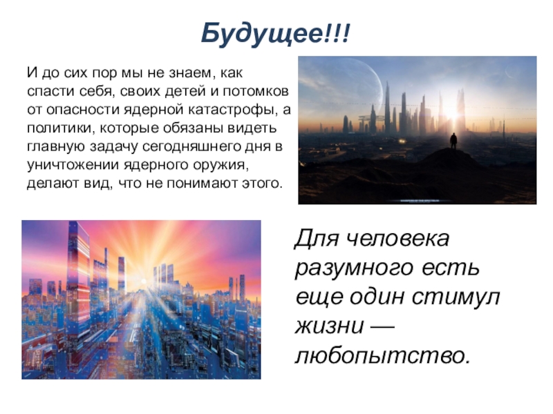 детей и потомков от опасности ядерной катастрофы, а политики, которые обязаны видеть главную задачу сегодняшнего дня в уничтожении ядерного оружия, делают вид, что не понимают этого.