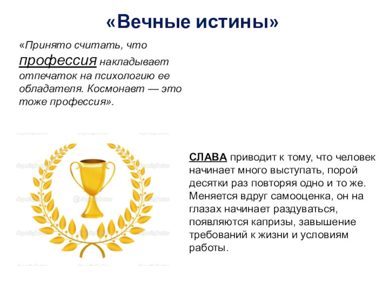 СЛАВА приводит к тому, что человек начинает много выступать, порой десятки раз повторяя одно и то же. Меняется вдруг самооценка, он на глазах начинает раздуваться, появляются капризы, завышение требований к жизни и условиям работы.