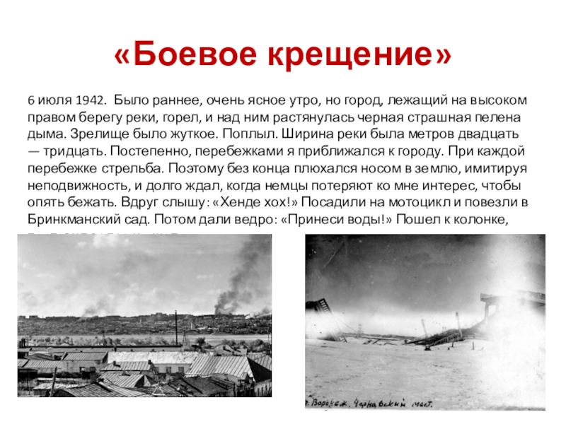лежащий на высоком правом берегу реки, горел, и над ним растянулась черная страшная пелена дыма. Зрелище было жуткое. Поплыл. Ширина реки была метров двадцать — тридцать. Постепенно, перебежками я приближался к городу. При каждой перебежке стрельба. Поэтому без конца плюхался носом в землю, имитируя неподвижность, и долго ждал, когда немцы потеряют ко мне интерес, чтобы опять бежать. Вдруг слышу: «Хенде хох!» Посадили на мотоцикл и повезли в Бринкманский сад. Потом дали ведро: «Принеси воды!» Пошел к колонке, поставил ведро и ушел.