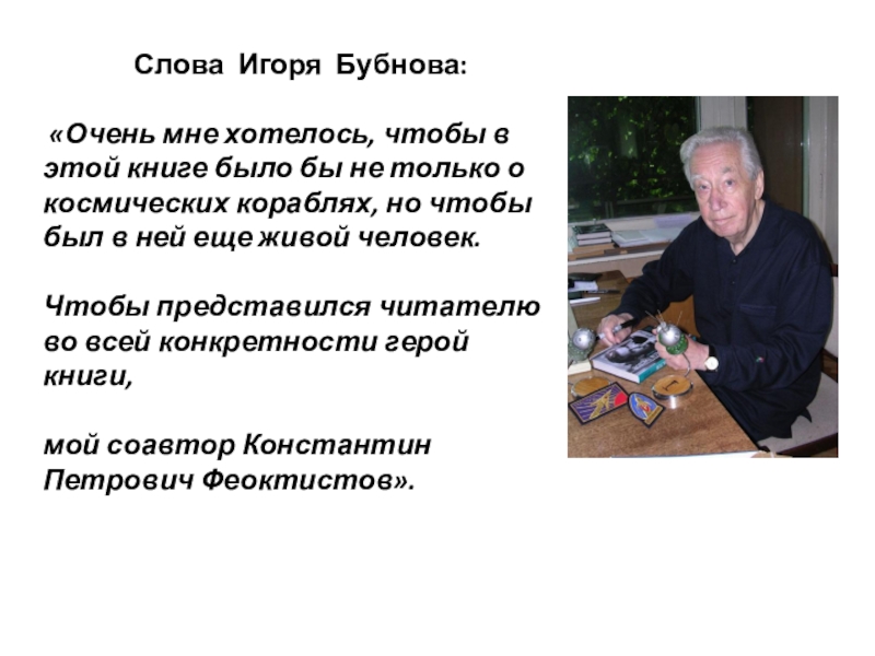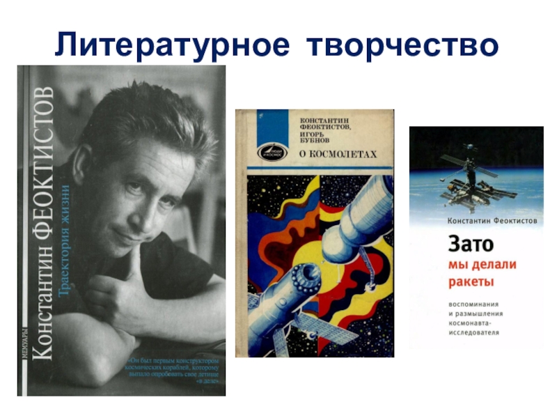 3. Константин Феоктистов, Игорь Бубнов. О космолётах. Книга о жизни и работе космонавта-инженера, диалоги о появлении первых космических кораблей, о путях и проблемах развития пилотируемых космических полётов, о космическом будущем человечества. (Серия «Люди и космос»). М.: Молодая гвардия, 1982.
