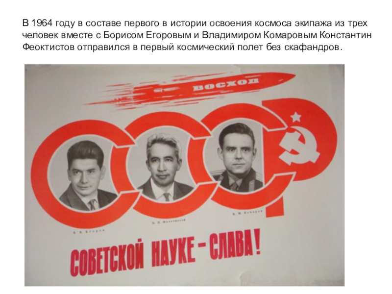 Слайд 14В 1964 году в составе первого в истории освоения космоса экипажа