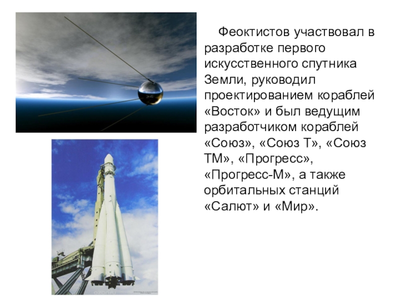 Слайд 12 Феоктистов участвовал в разработке первого искусственного спутника Земли, руководил