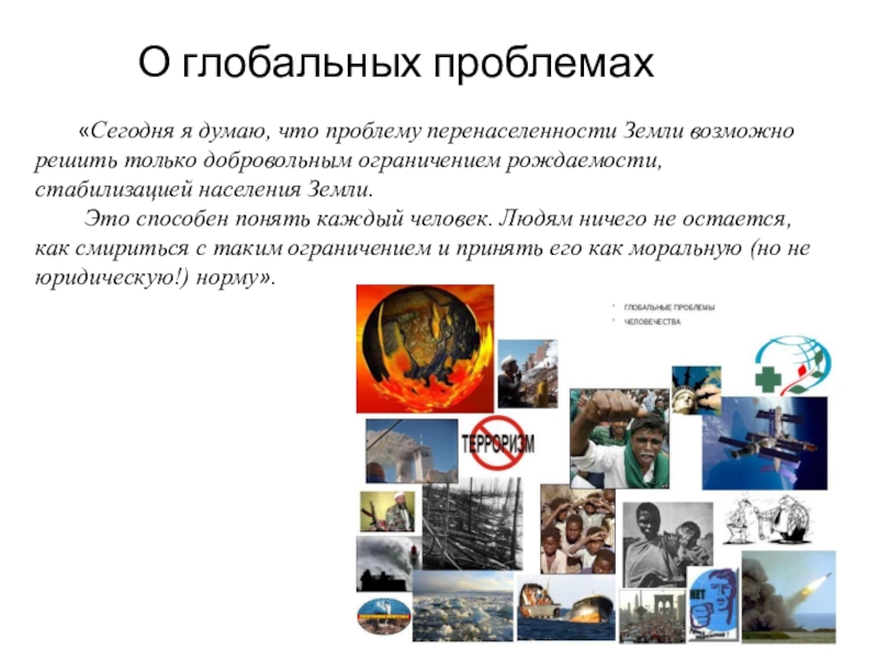 перенаселенности Земли возможно решить только добровольным ограничением рождаемости, стабилизацией населения Земли.