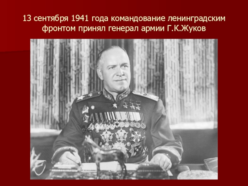 Слайд 413 сентября 1941 года командование ленинградским фронтом принял генерал армии Г.К.Жуков