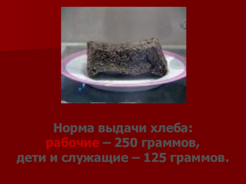 Слайд 11Норма выдачи хлеба: рабочие – 250 граммов, дети и служащие – 125 граммов.