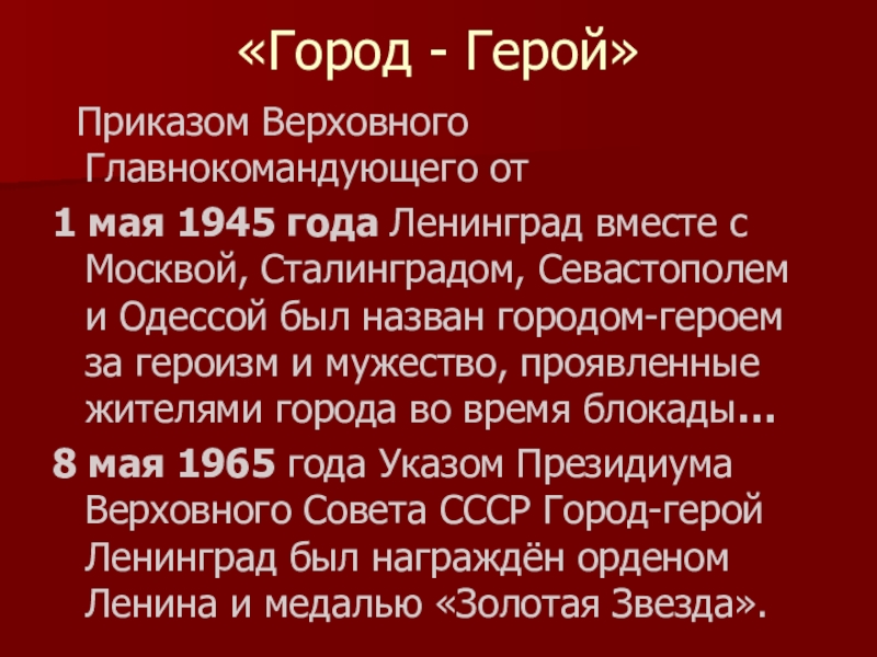 «Город - Герой» Приказом Верховного Главнокомандующего от 1 мая 1945 года Ленинград вместе с Москвой, Сталинградом, Севастополем
