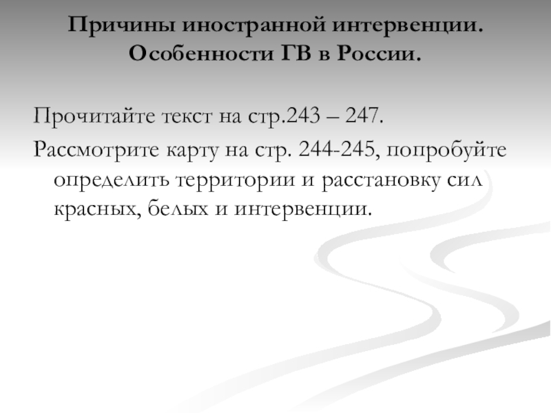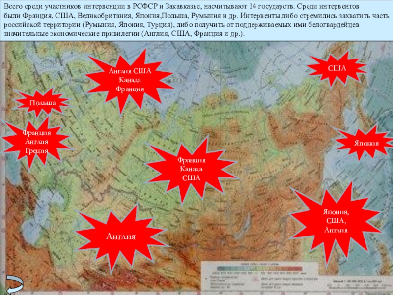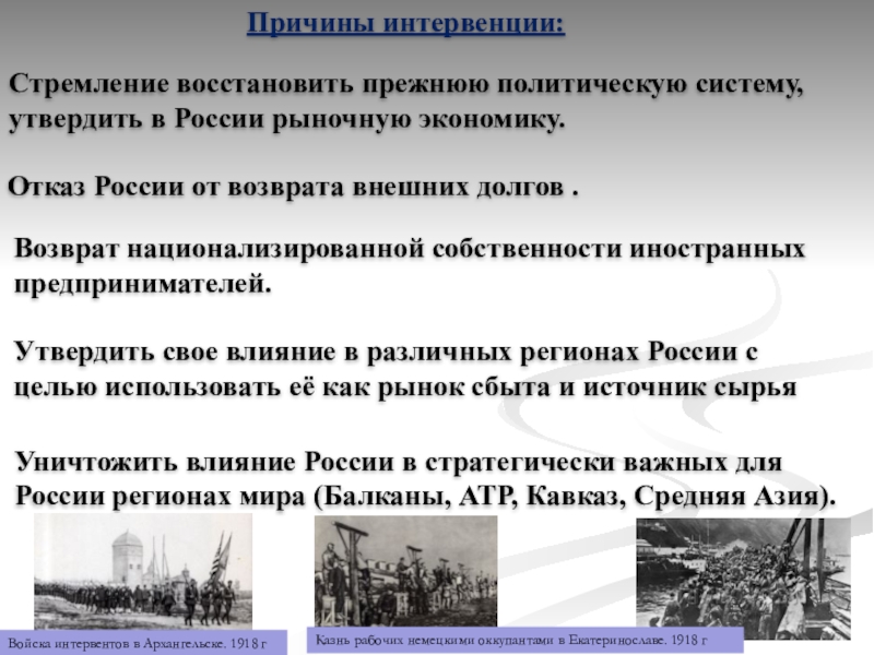Вмешательство иностранных государств во внутренние дела России. Интервенция стала катализатором гражданской войны, а поддержка странами Антанты белогвардейских войск и правительств во многом обусловила длительность этой войны.