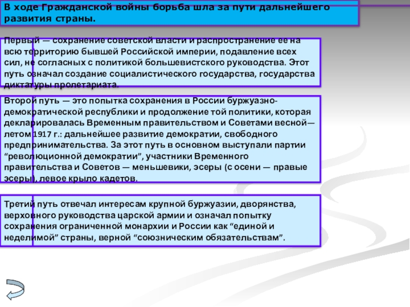 Первый — сохранение советской власти и распространение ее на всю территорию бывшей Российской империи, подавление всех сил, не согласных с политикой большевистского руководства. Этот путь означал создание социалистического государства, государства диктатуры пролетариата.