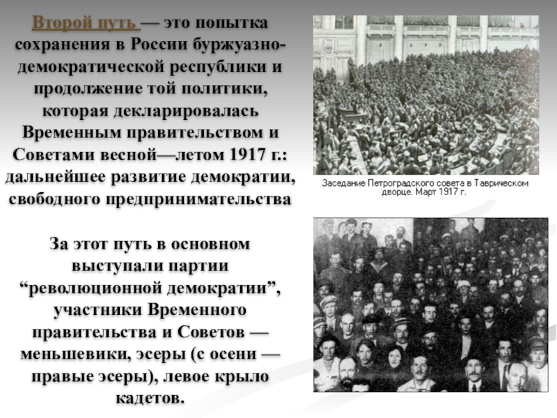 Второй путь — это попытка сохранения в России буржуазно-демократической республики и продолжение той политики, которая декларировалась Временным правительством и Советами весной—летом 1917 г.: дальнейшее развитие демократии, свободного предпринимательства. За этот путь в основном выступали партии “революционной демократии”, участники Временного правительства и Советов — меньшевики, эсеры (с осени — правые эсеры), левое крыло кадетов.
