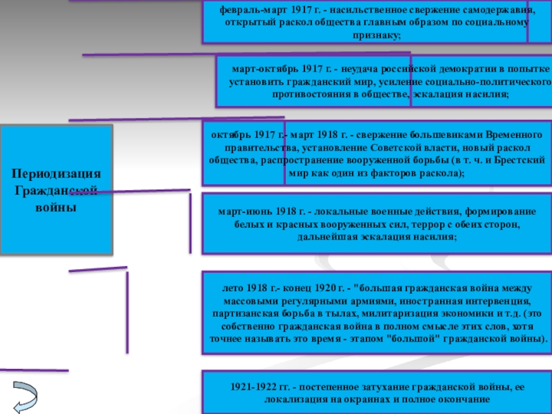 октябрь 1917 г.- март 1918 г. - свержение большевиками Временного правительства, установление Советской власти, новый раскол общества, распространение вооруженной борьбы (в т. ч. и Брестский мир как один из факторов раскола);