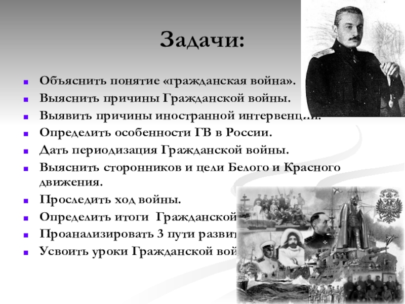 Первый — сохранение советской власти и распространение ее на всю территорию бывшей Российской империи, подавление всех сил, не согласных с политикой большевистского руководства.