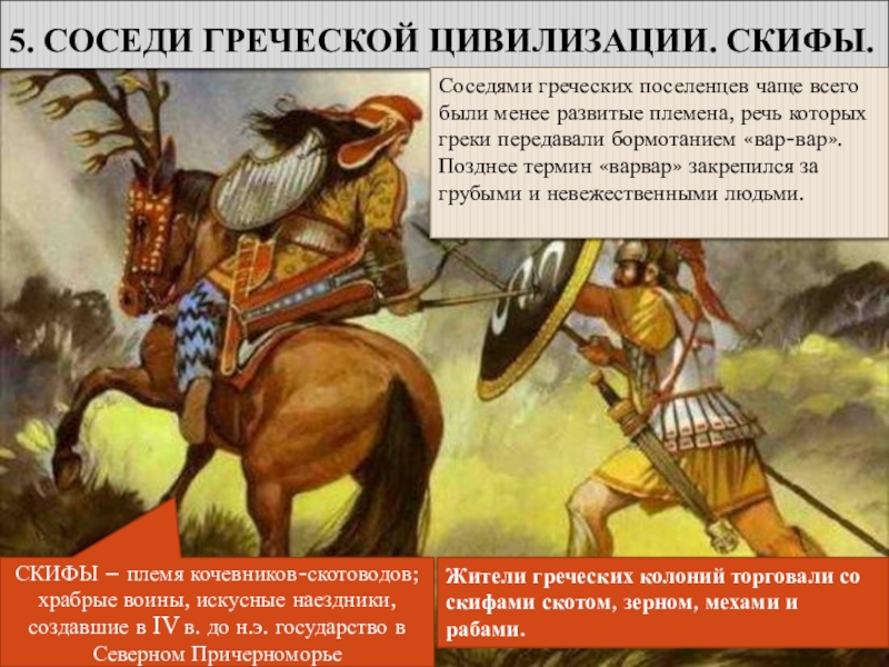 Жители греческих колоний торговали со скифами скотом, зерном, мехами и рабами.