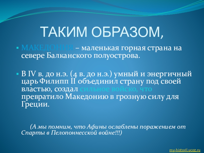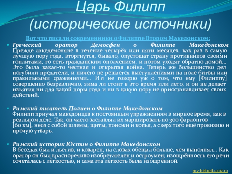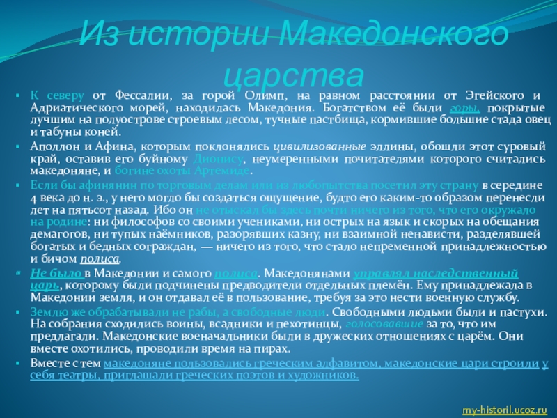 Не было в Македонии и самого полиса. Македонянами управлял наследственный царь, которому были подчинены предводители отдельных племён. Ему принадлежала в Македонии земля, и он отдавал её в пользование, требуя за это нести военную службу.