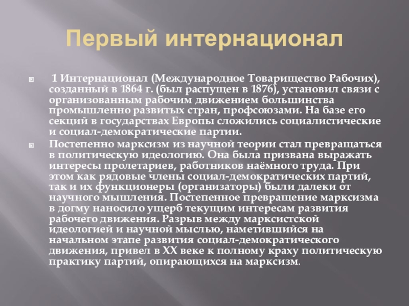 1 Интернационал (Международное Товарищество Рабочих), созданный в 1864 г. (был