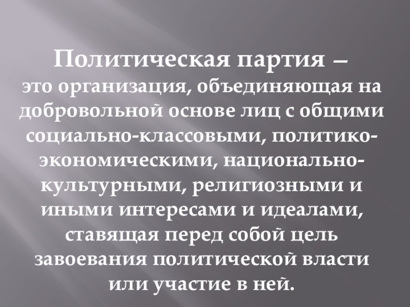социально-классовыми, политико-экономическими, национально-культурными, религиозными и иными интересами и идеалами, ставящая перед собой цель завоевания политической власти или участие в ней.