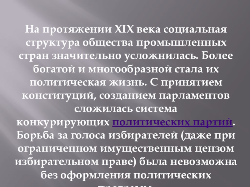 Более богатой и многообразной стала их политическая жизнь. С принятием конституций, созданием парламентов сложилась система конкурирующих политических партий. Борьба за голоса избирателей (даже при ограниченном имущественным цензом избирательном праве) была невозможна без оформления политических программ.