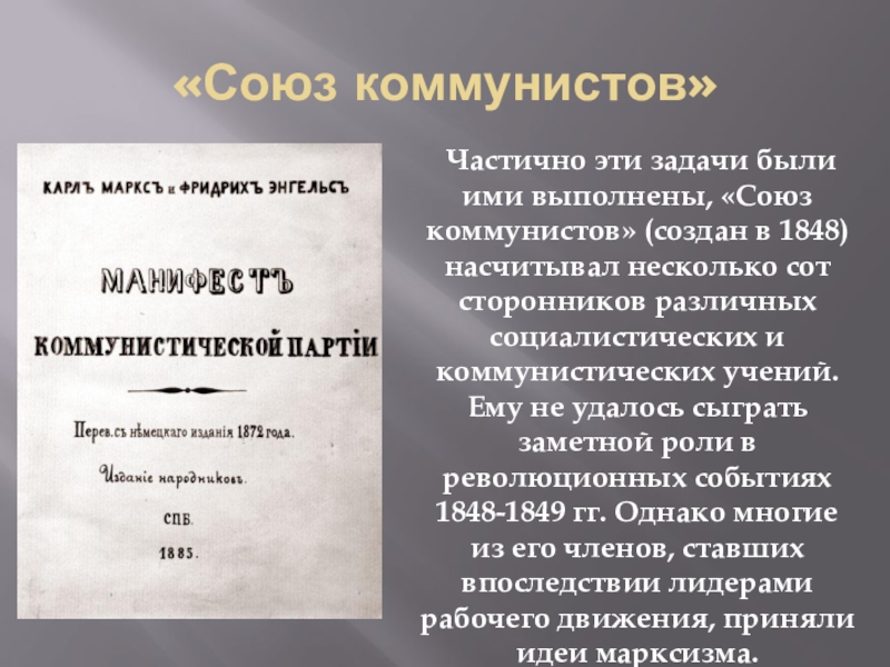 1848) насчитывал несколько сот сторонников различных социалистических и коммунистических учений. Ему не удалось сыграть заметной роли в революционных событиях 1848-1849 гг. Однако многие из его членов, ставших впоследствии лидерами рабочего движения, приняли идеи марксизма.