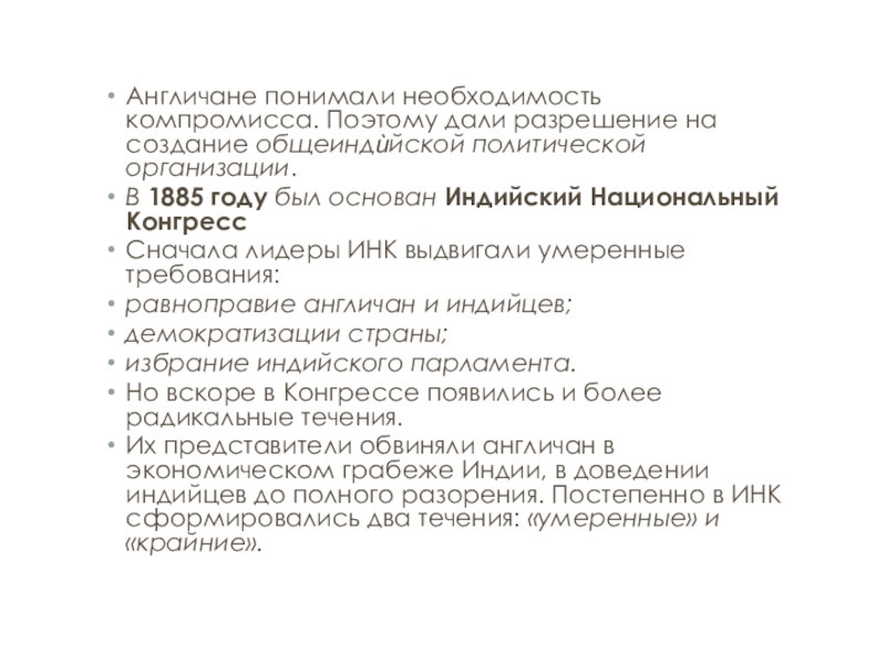 Слайд 28Англичане понимали необходимость компромисса. Поэтому дали разрешение на создание общеиндѝйской политической организации.