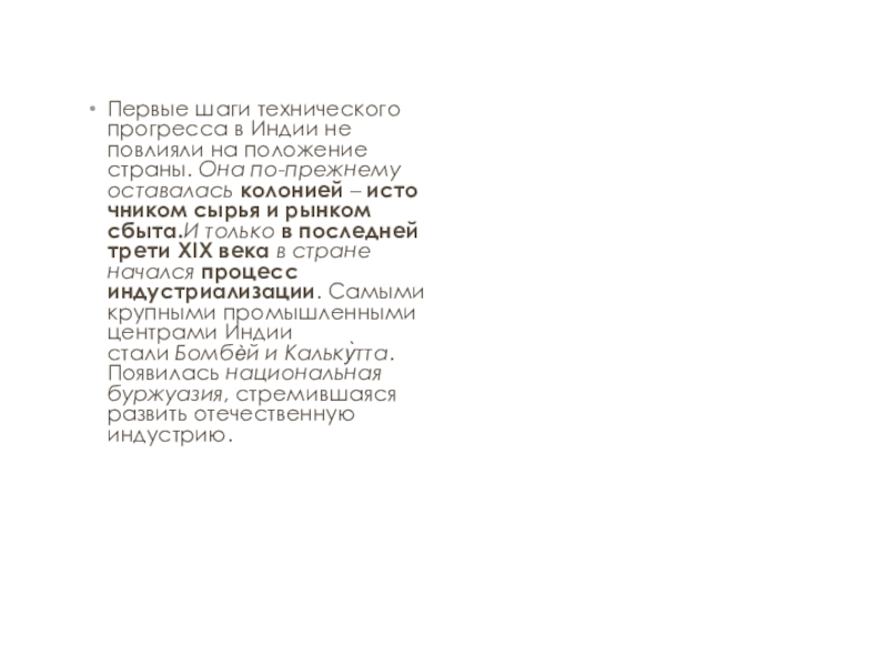 по-прежнему оставалась колонией – источником сырья и рынком сбыта.И только в последней трети XIX века в стране начался процесс индустриализации. Самыми крупными промышленными центрами Индии стали Бомбѐй и Кальку̀тта. Появилась национальная буржуазия, стремившаяся развить отечественную индустрию.