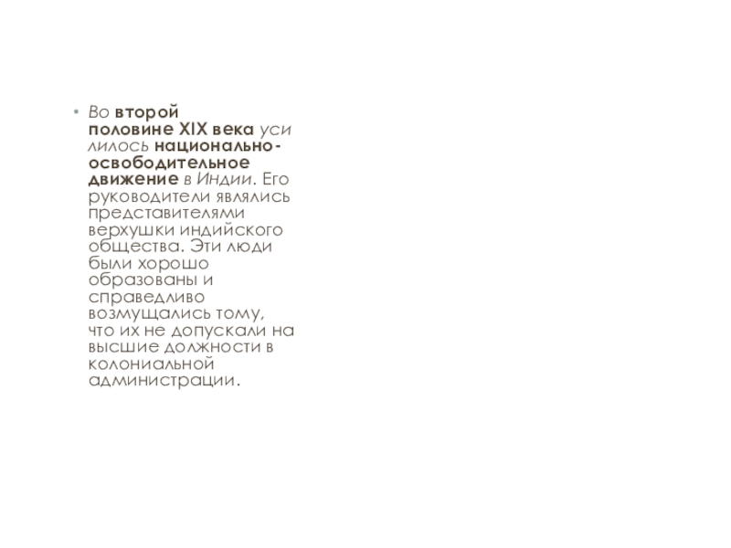 Слайд 27Во второй половине XIX века усилилось национально-освободительное движение в Индии. Его руководители являлись представителями верхушки индийского общества. Эти