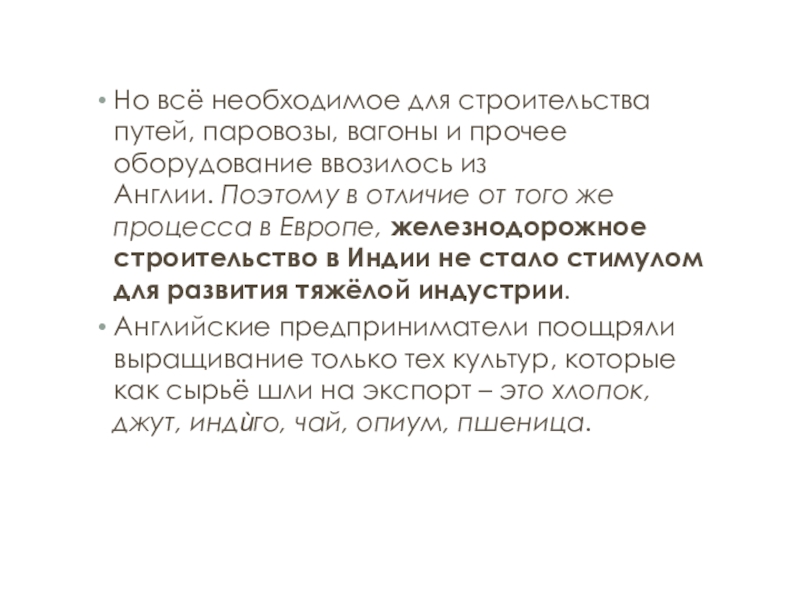 ввозилось из Англии. Поэтому в отличие от того же процесса в Европе, железнодорожное строительство в Индии не стало стимулом для развития тяжёлой индустрии.