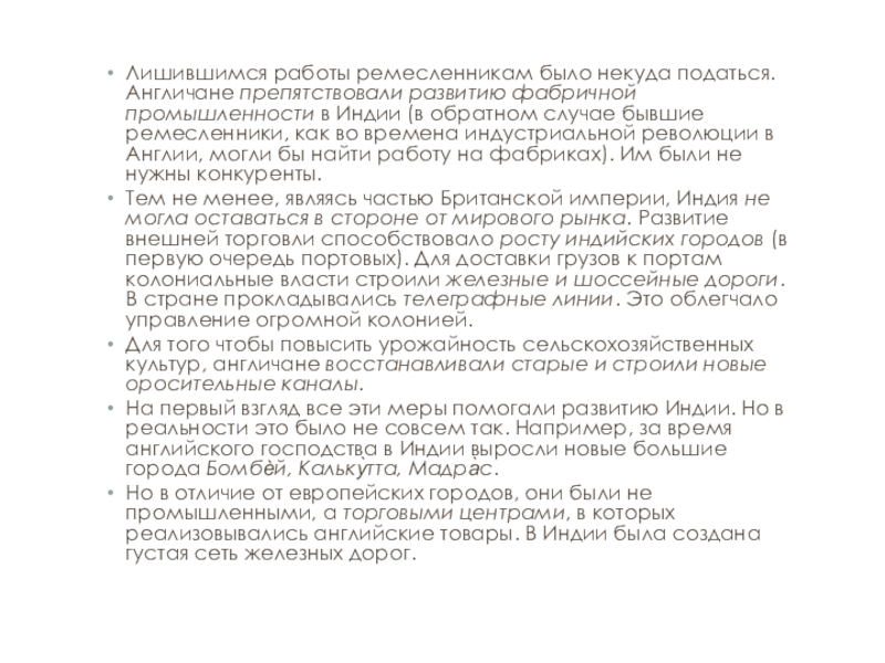 На первый взгляд все эти меры помогали развитию Индии. Но в реальности это было не совсем так. Например, за время английского господства в Индии выросли новые большие города Бомбѐй, Кальку̀тта, Мадра̀с.