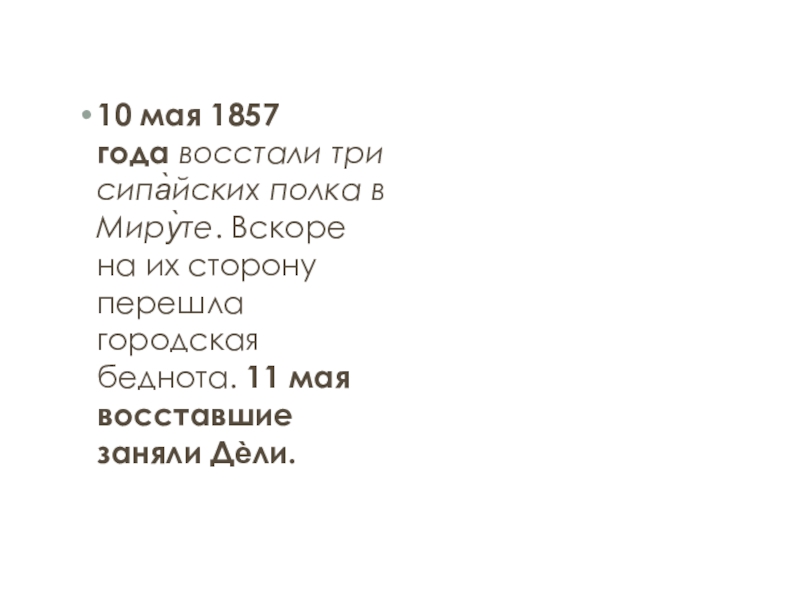 Слайд 2110 мая 1857 года восстали три сипа̀йских полка в Миру̀те. Вскоре на