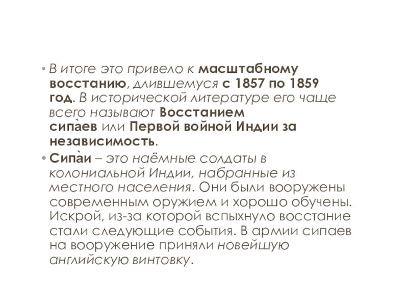 Слайд 19В итоге это привело к масштабному восстанию, длившемуся с 1857 по 1859 год. В исторической