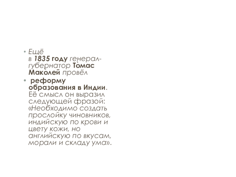 фразой: «Необходимо создать прослойку чиновников, индийскую по крови и цвету кожи, но английскую по вкусам, морали и складу ума».