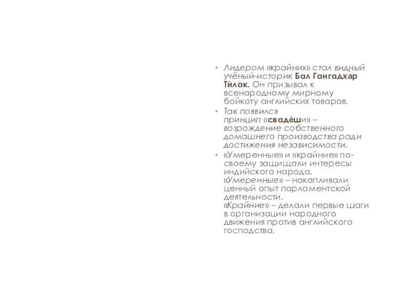 Слайд 29Лидером «крайних» стал видный учёный-историк Бал Гангадха̀р Тѝлак. Он призывал к всенародному мирному