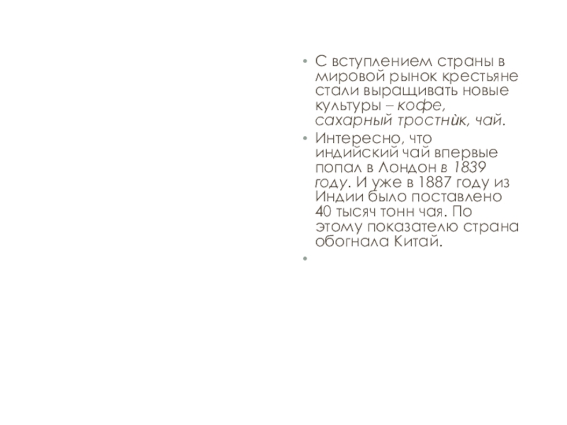 Слайд 17С вступлением страны в мировой рынок крестьяне стали выращивать новые культуры
