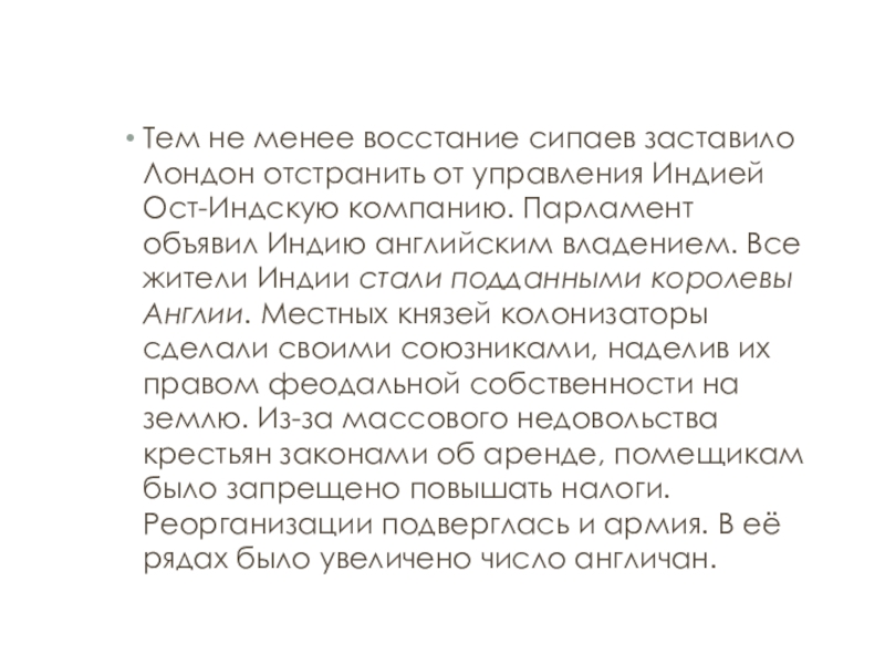 Ост-Индскую компанию. Парламент объявил Индию английским владением. Все жители Индии стали подданными королевы Англии. Местных князей колонизаторы сделали своими союзниками, наделив их правом феодальной собственности на землю. Из-за массового недовольства крестьян законами об аренде, помещикам было запрещено повышать налоги. Реорганизации подверглась и армия. В её рядах было увеличено число англичан.
