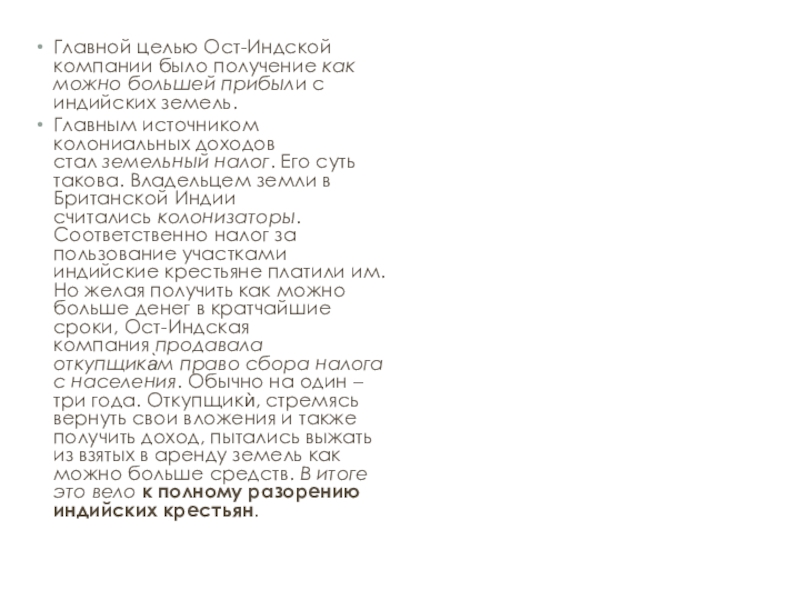 Главным источником колониальных доходов стал земельный налог. Его суть такова. Владельцем земли в Британской Индии считались колонизаторы. Соответственно налог за пользование участками индийские крестьяне платили им. Но желая получить как можно больше денег в кратчайшие сроки, Ост-Индская компания продавала откупщика̀м право сбора налога с населения. Обычно на один – три года. Откупщикѝ, стремясь вернуть свои вложения и также получить доход, пытались выжать из взятых в аренду земель как можно больше средств. В итоге это вело к полному разорению индийских крестьян.