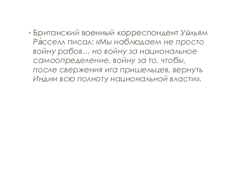 Слайд 24Британский военный корреспондент Уѝльям Ра̀сселл писал: «Мы наблюдаем не просто войну рабов… но войну