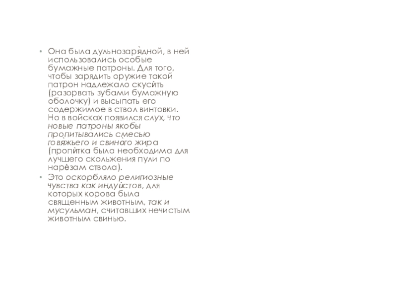 Сипа̀и – это наёмные солдаты в колониальной Индии, набранные из местного населения. Они были вооружены современным оружием и хорошо обучены. Искрой, из-за которой вспыхнуло восстание стали следующие события. В армии сипаев на вооружение приняли новейшую английскую винтовку.