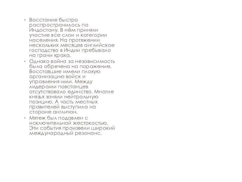 Восстание сипаев положило конец господству Ост-Индской компании. Англичане были вынуждены пойти на ряд уступок индийцам.