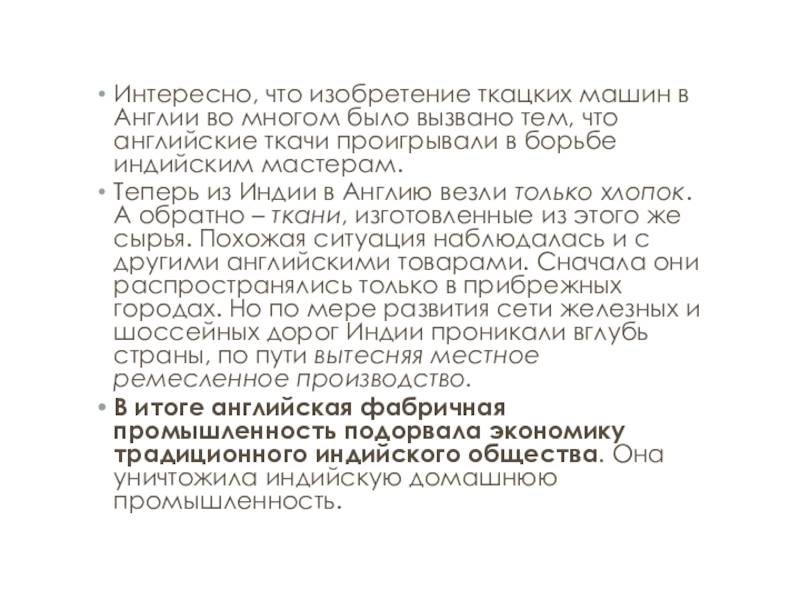 В итоге английская фабричная промышленность подорвала экономику традиционного индийского общества. Она уничтожила индийскую домашнюю промышленность.