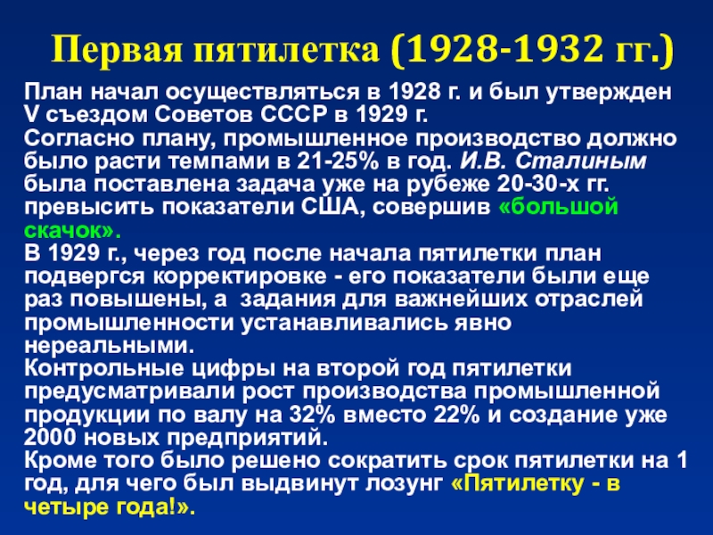 Согласно плану, промышленное производство должно было расти темпами в 21-25% в год. И.В. Сталиным была поставлена задача уже на рубеже 20-30-х гг. превысить показатели США, совершив «большой скачок».