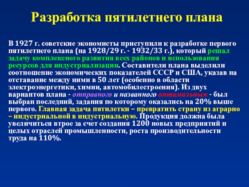 пятилетнего плана (на 1928/29 г. - 1932/33 г.), который решал задачу комплексного развития всех районов и использования ресурсов для индустриализации. Составители плана выделили соотношение экономических показателей СССР и США, указав на отставание между ними в 50 лет (особенно в области электроэнергетики, химии, автомобилестроения). Из двух вариантов плана - отправного и названного оптимальным - был выбран последний, задания по которому оказались на 20% выше первого. Главная задача пятилетки – превратить страну из аграрно – индустриальной в индустриальную. Продукция должна была увеличиться втрое за счет создания 1200 новых предприятий и целых отраслей промышленности, роста производительности труда на 110%.